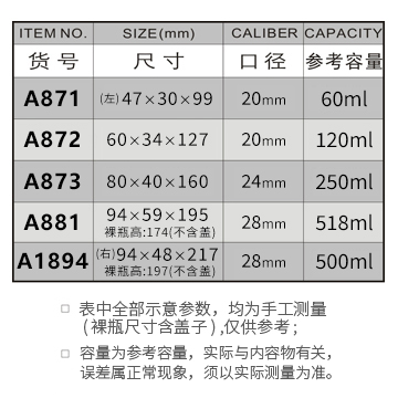 A871-60ML/A872-120ML/A873-250ML/A881-518ML/A1894-500ML