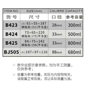 B423-300ML/B424-500ML/B425-800ML/BJ505-680ML