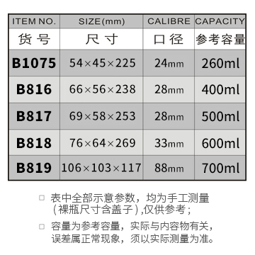 B1075-260ML/B816-400ML/B817-500ML/B818-600ML/B819-700ML