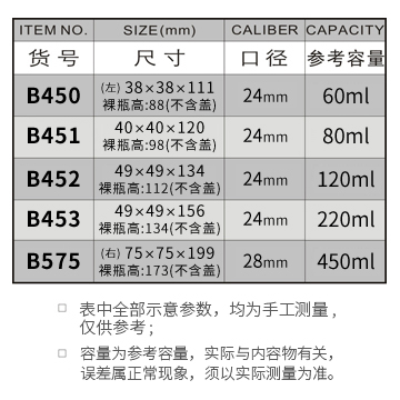 B450-60ML/B451-80ML/B452-120ML/B453-220ML/B575-450ML