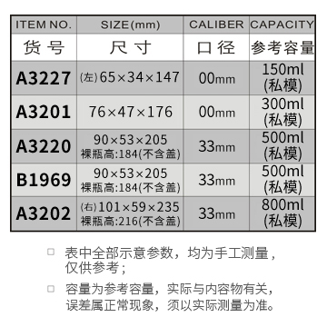 A3227-150ML/A3201-300ML/A3220-500ML/B1969-500ML/A3202-750ML