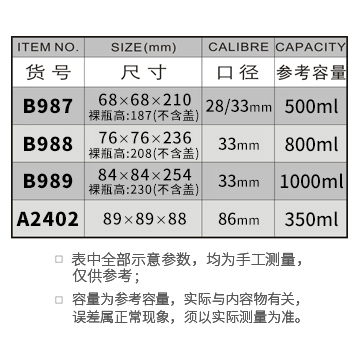 B987-500ML/B988-800ML/ B989-1000ML/ A2402-350ML