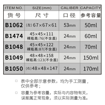 B1062-50ML/B1474-60ML/B1048-70ML/B1049-120ML/B1050-170ML