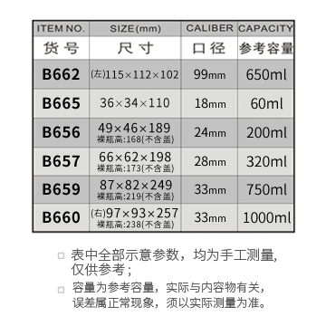 B662-650ML/B665-60ML/B656-200ML/B657-320ML/B659-750ML/B660-1000ML