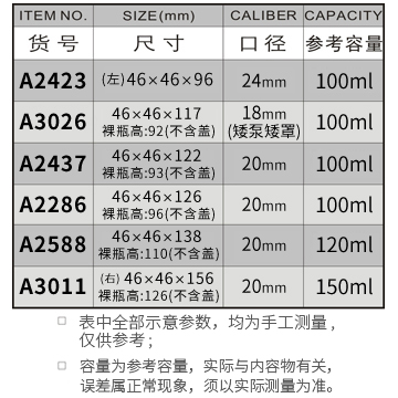 A2423-100ML/A3026-100ML/A2437-100ML/A2286-100ML/A2588-120ML/A3011-150ML