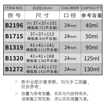 B2196-40ML/B1715-50ML/B1319-90ML/B1320-125ML/B1272-130ML