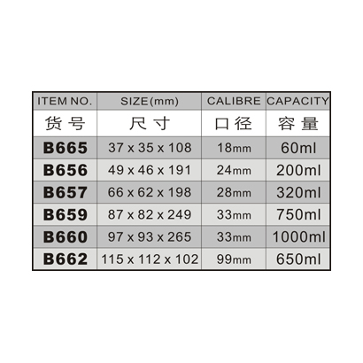 B665-60ML/B656-200ML/B657-320ML/B659-750ML/B660-1000ML/B662-650ML