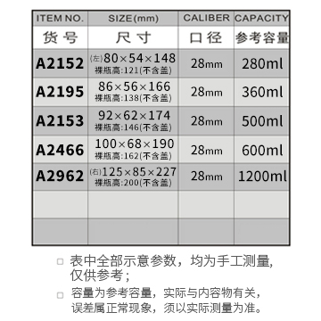 A2152-280ML/A2195-360ML/A2153-500ML/A2466-600ML/A2962-1200ML