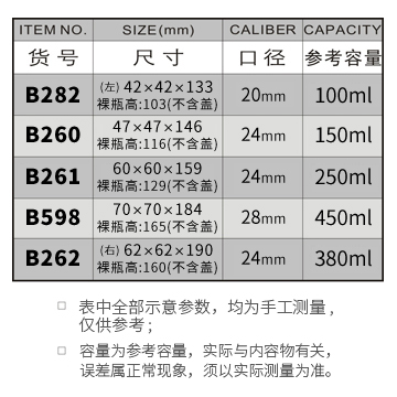 B260-150ML/B261-250ML/B262-380ML/B598-450ML/B282-100ML