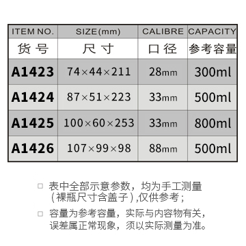 A1423-300ML/A1424-500ML/A1425-800ML/A1426-500ML