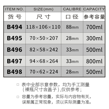 B494-700ML/B495-300ML/B496-500ML/B497-800ML/B498-500ML