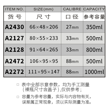 A2430-350ML/A2127-500ML/A2128-800ML/A2472-500ML/A2272-1000ML