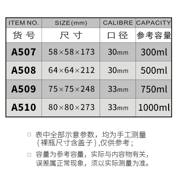 A507-300ML/A508-500ML/A509-750ML/A510-1000ML