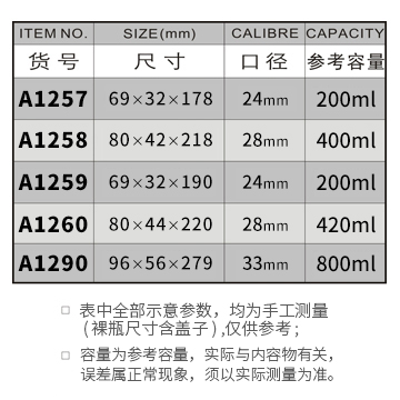 A1257-200ML/A1258-400ML/A1259-200ML/A1260-420ML/A1290-800ML