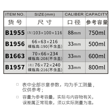B1955-750ML/B1956-500ML/B1663-600ML/B1957-800ML