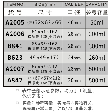 A2005-50ML/A2006-300ML/B841-300ML/B623-260ML/A2007-500ML/B842-500ML