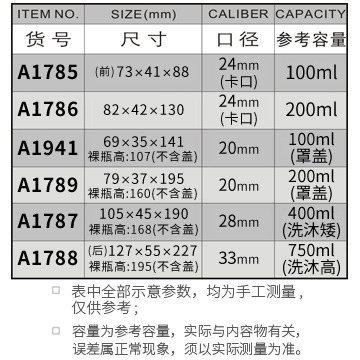 A1785-100ML/A1786-200ML/A1941-100ML/A1789-200ML/A1787-400ML/A1788-750ML