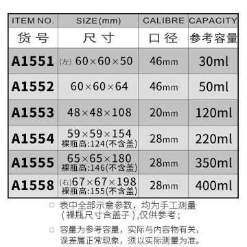 A1551-30ML/A1552-50ML/A1553-120ML/A1554-220ML/A1555-350ML/A1558-400ML