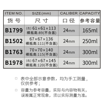 B1799-165ML/B1502-250ML/B1763-300ML/B1978-300ML